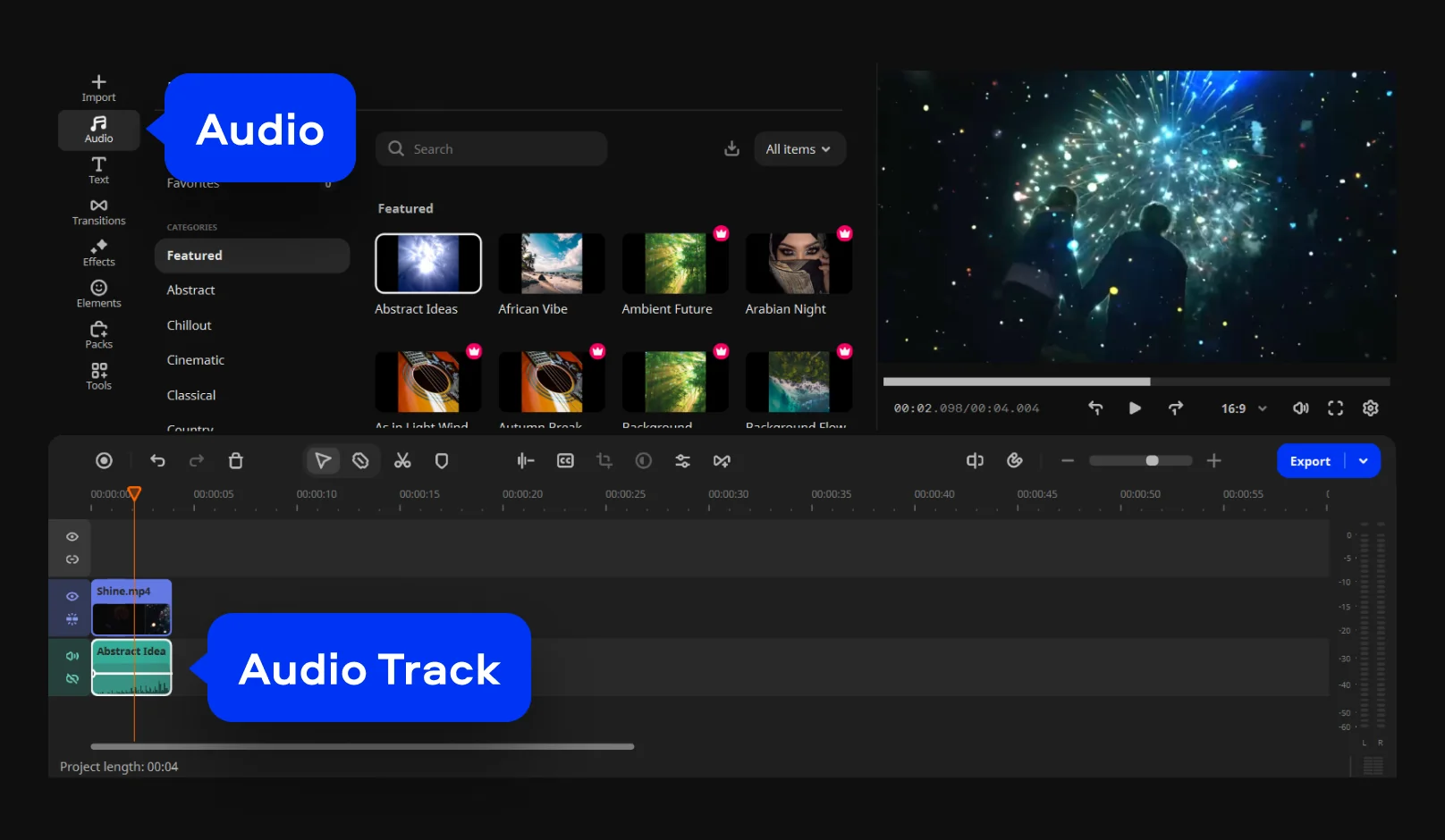 Click Add Files and select the audio file you want to use and drag and drop it into the Audio Track. You can also choose a track from the built-in music collection – just open the Audio tab and drag your selected track to the Timeline.