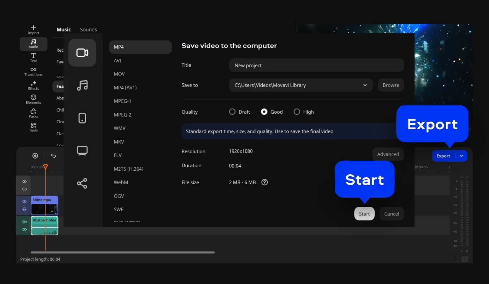 Click Export to save your video in your preferred format. Once you’ve chosen the format, click Start to save the file.