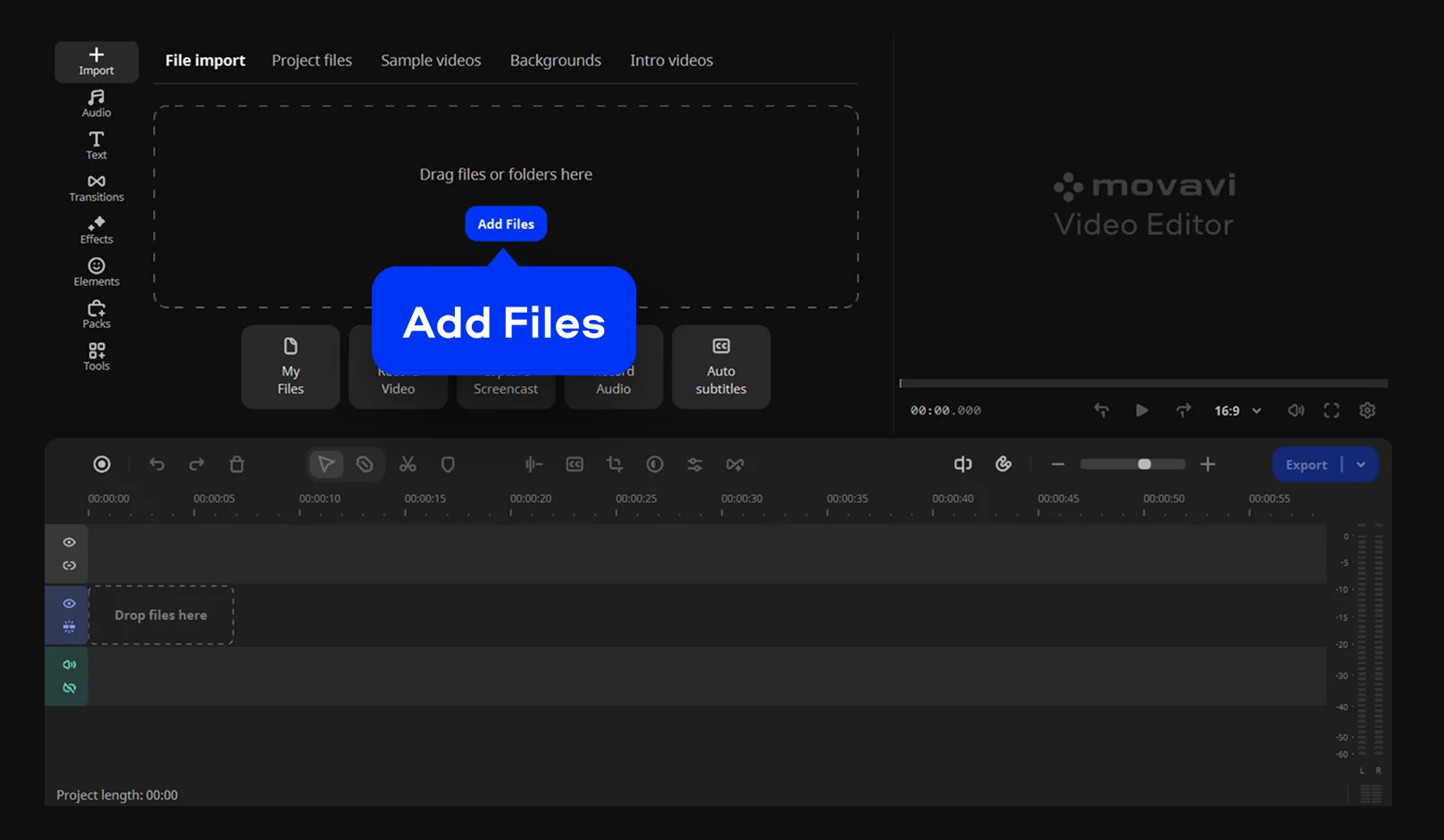 Click Add Files and select the video you want to edit. Then drag and drop your file into the Timeline.