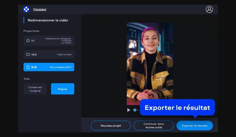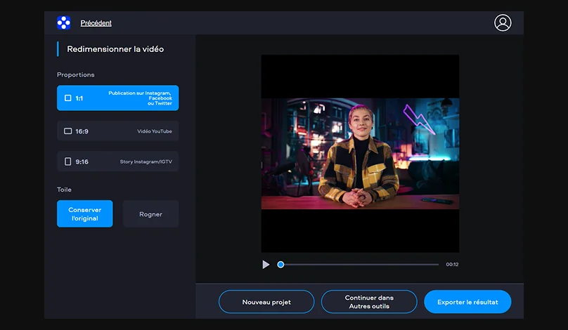 Un outil gratuit de redimensionnement vidéo, basé sur un navigateur, vous permet de redimensionner une vidéo en ligne dans l'onglet actuel, sans téléchargement de logiciel de bureau ni vérification du système. Un changeur de format vidéo est compatible avec le format MP4 et d'autres formats courants, comme MOV et AVI, et permet aux utilisateurs de changer les proportions avant d'exporter le fichier mis à jour.