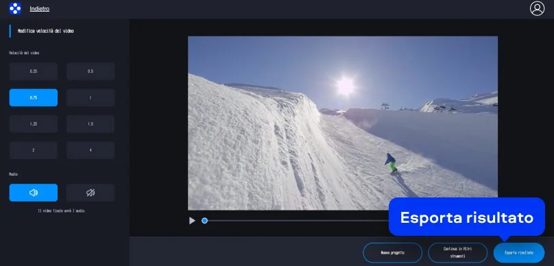 Usa il controllo della velocità per scegliere il ritmo che preferisci. Puoi rendere il video più veloce per contenuti brevi, clip in stile time-lapse o per una riproduzione più rapida. Puoi anche rallentarlo se vuoi che il movimento sia più naturale o più facile da seguire. L’anteprima ti aiuta a verificare se il nuovo ritmo è naturale prima di esportare.